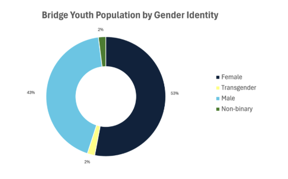 [Alt text: A donut graph shows the breakdown of Bridge’s youth population by gender identity. It reads: Female 53%, Male 43%, Transgender 2%, and Non-binary 2%]