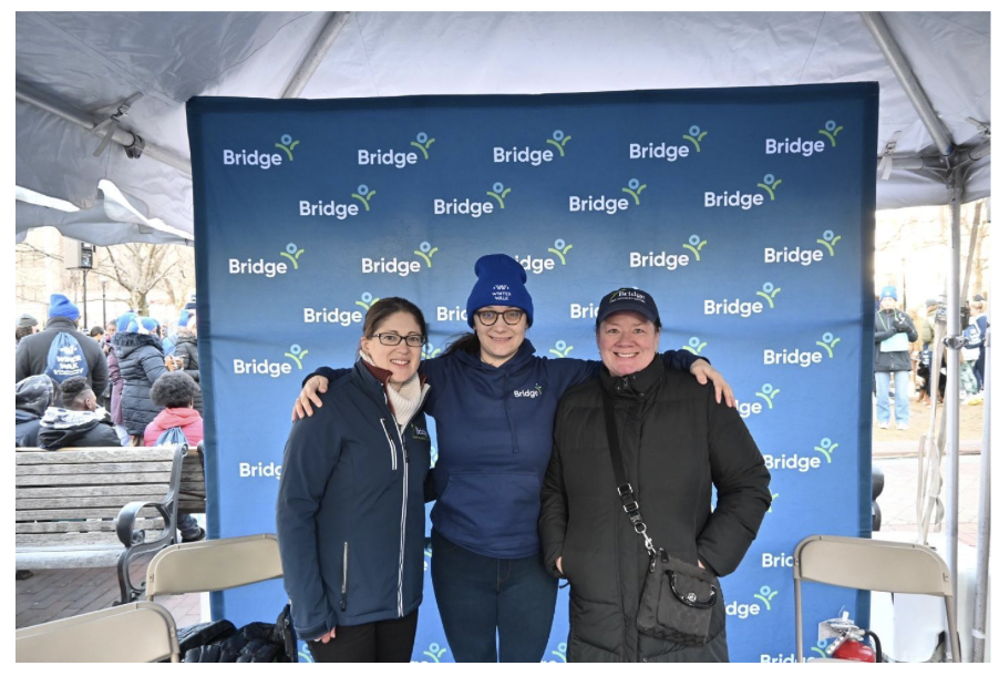 [Alt text: three people stand huddled together in front of a banner with the “Bridge” logo on it. They are outdoors, wearing full winter gear and smiling brightly. People are seen gathered in the distance waiting to start the walk.]
