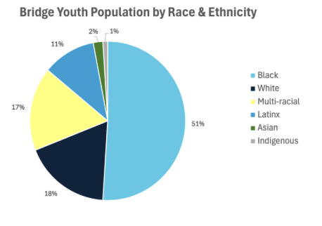 [Alt text: a pie chart displays the racial and ethnic composition of Bridge’s youth population. The segments are: Black 51%, White 18%, Multi-racial 17%, Latinx 11%, Asian 2%, and Indigenous 1%.]